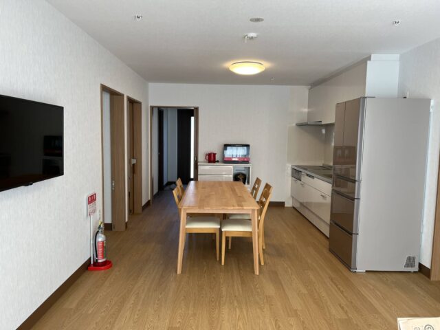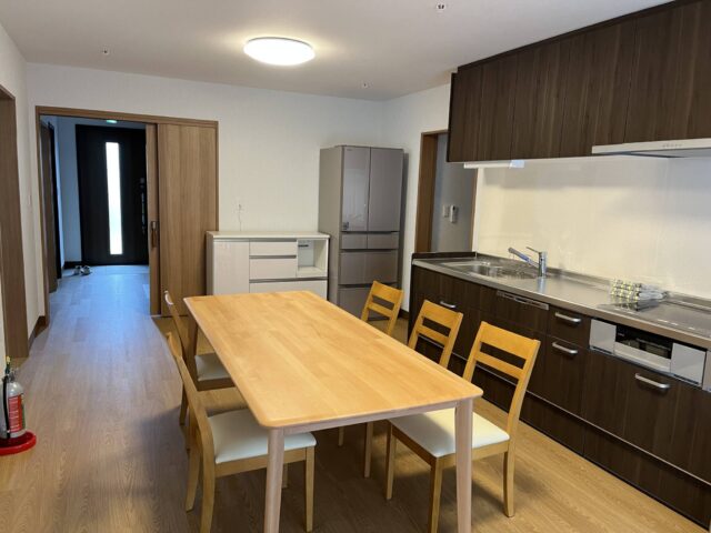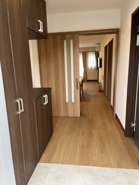 扉を開けると広々としたフロアとなっております。生活を共にするご利用者様との雑談スペースにも!
